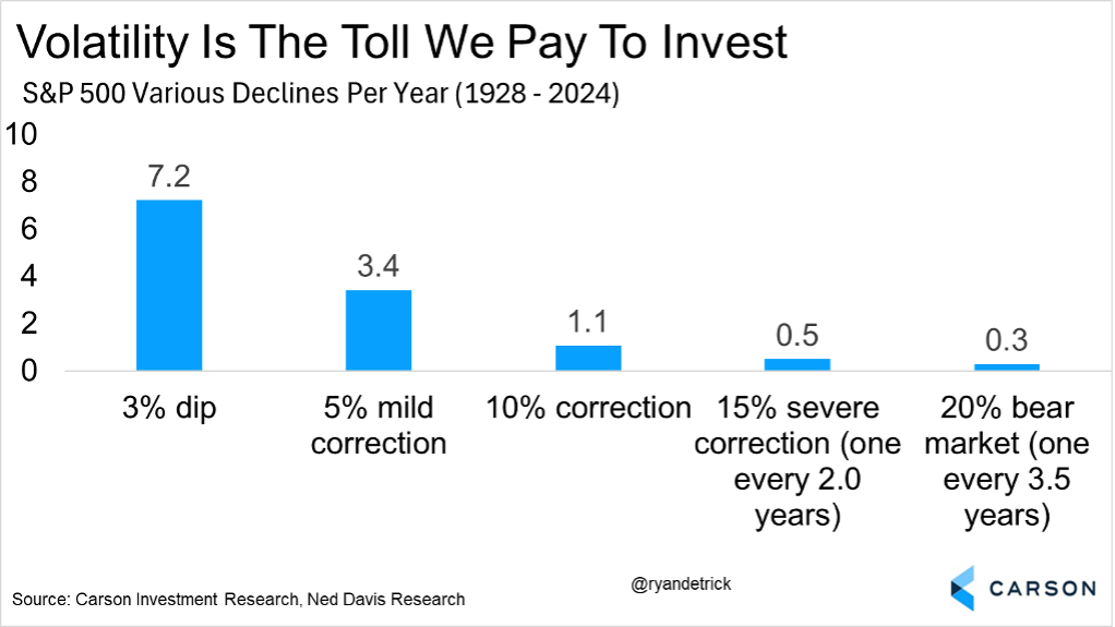 If you’ve read these missives before then you’ve probably heard us say that volatility is the toll we pay to invest. So 2025 won’t be the first year ever to go up each day and never have a scary headline, because that’s just not the way that markets work. This is officially the first 5% mild correction of 2025, something that even the best years tend to see, and no reason in itself to become pessimistic. In fact, we had two 5% mild corrections last year plus a 10% correction, and one mild correction in 2023, but both years that gained more than 20% when all was said and done. And trust us, during each of those times the past two years fear was rampant on the weakness, just as we are seeing currently. Could this weakness turn into a 10% correction? Given stocks are down about 6% from the recent high, that is quite possible, but we do not expect things to get much worse and the odds of a full-blown bear markets are quite slim. As uncomfortable as this recent volatility feels, know that it is the toll we must pay to invest.