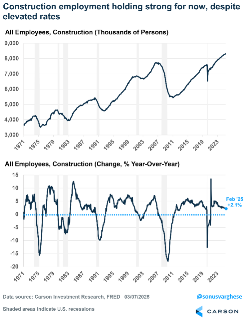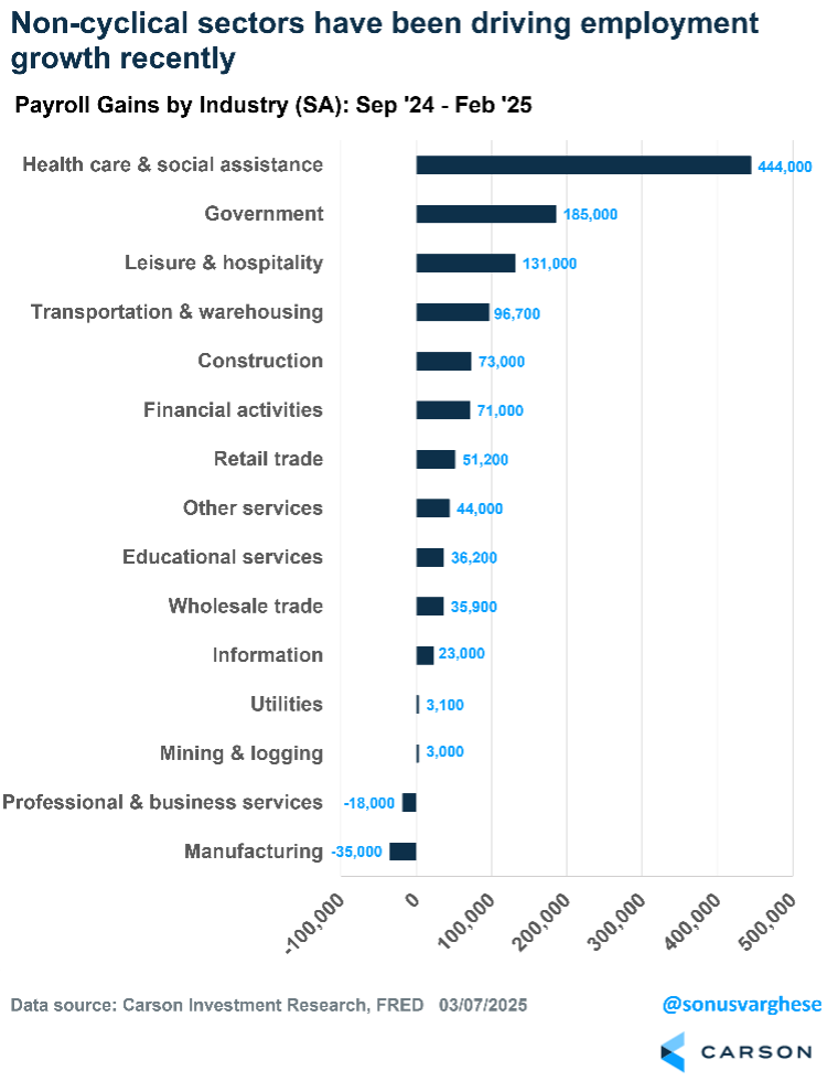 The largest, and perhaps adverse, impact of the tariff overhang is that it keeps the Fed waiting on the sidelines for longer before continuing with rate cuts. Elevated rates are clearly hurting parts of the economy, but the Fed doesn’t look ready to provide relief anytime soon—they’re going to want to wait to see what happens with tariffs. The Fed would likely act sooner rather than later if they thought the labor market was deteriorating, but the February data tells us that’s not the case. That takes away any urgency for further rate cuts. But that also raises the probability of something actually breaking before they act. (I’ll note that the housing market in particular is not going to function well with near 7% mortgage rates.) It comes back to the biggest risk we highlighted in our 2025 Outlook, the risk of interest rates staying too high, which could cause a break in the cyclical economy that drags everything else lower. There’s also a risk that the big drivers of recent employment gains (health care and state/local governments) start to see headwinds amid federal government cuts that result in less money being sent to the states (including for Medicaid, particularly in rural areas).