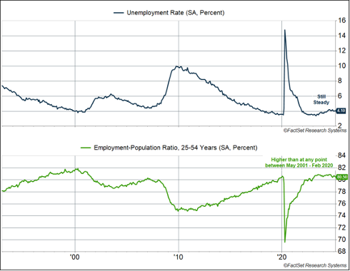 The unemployment rate rose to 4.1%, though that’s lower than historical averages. Even the prime-age (25-54) employment-population ratio, which corrects for an aging population and definitional issues around who is unemployed, pulled back from 80.7% to 80.5%, but that’s still higher than anything we saw over the last two expansion cycles (2003 – 2007 and 2009 – 2019). Other data show that layoffs remain low, but it’s getting a little harder to find a job.