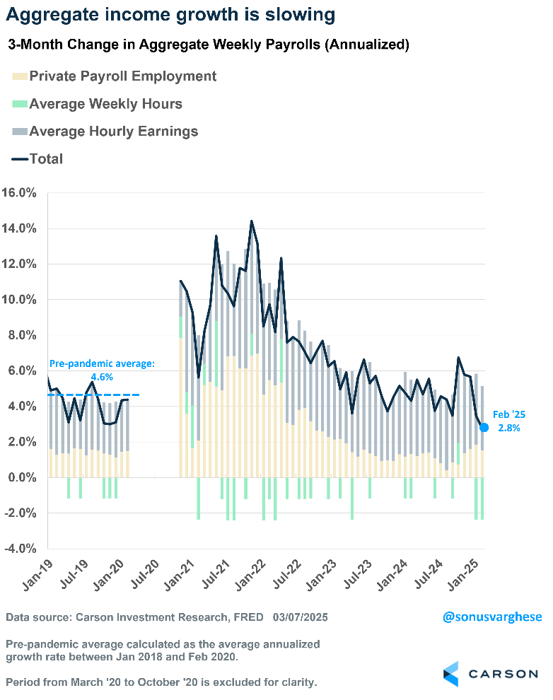 Cue to last week, and there’s been a big swing in sentiment. It’s not just the uncertainty from tariffs. Economic data has been coming in on the softer side (but not recessionary), and the February payroll data confirm the slowdown.