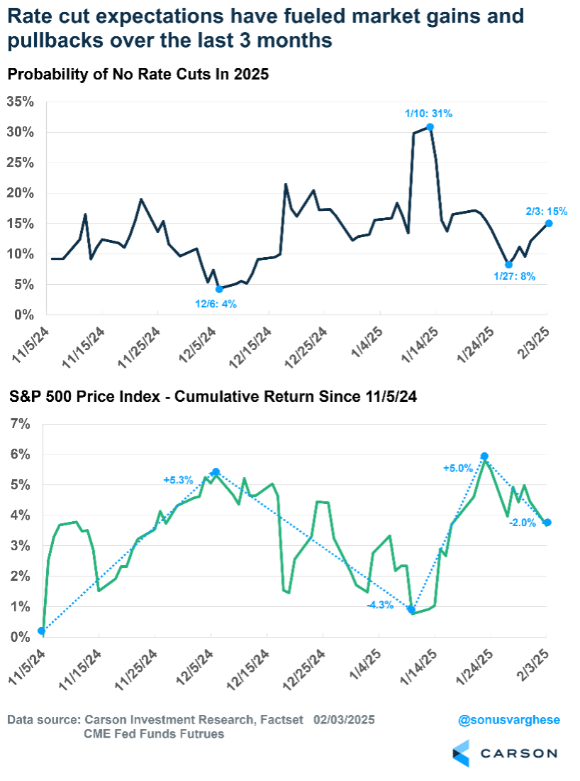 - Since then (through February 3rd), the probability of no cuts in 2025 has risen to almost 15%, and the S&P 500 has pulled back about 2%.