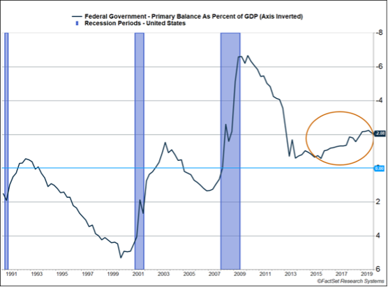 It helps to go back to 2018 – 2019 to understand this. Deficit spending surged after the Financial Crisis. The primary deficit rose to about 6.5% of GDP (the primary deficit is federal government spending excluding interest payments on debt). However, the deficit started to shrink after 2010, falling to about 0.5% of GDP in 2015. This is historically what happened as economic expansions wore on. Post-recession deficits shrink, and primary balances eventually head into a surplus. But the late 2010s were an exception. A big increase in federal spending, and lower revenue on the back of the 2017 tax cuts, sent the deficit higher. The primary deficit grew to about 2.1% of GDP by the end of 2019. Just from 2018 through 2019, the primary deficit grew by 0.7%, from 1.4% to 2.1% of GDP. As you can see from the chart below, these deficits were completely outside the historical norm. In both the 1990s and 2000s, the primary balance eventually became a surplus (crossing below the zero line below).