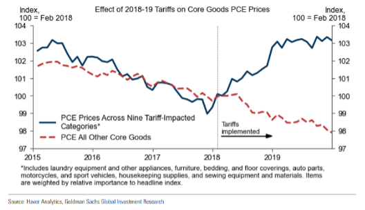 Core PCE inflation ran around 1.8% annualized in 2018 – 19, below the Fed’s target of 2%. So it’s natural to think that the 2018 – 19 trade war didn’t have any impact on price. However, this is not the case. Prices in tariffed categories rose by almost exactly the amount of imposed tariffs, just as you would expect. However, we were already in a downtrend for core goods inflation prior to the tariffs being imposed, which continued for non-tariffed goods and offset the overall inflationary impact.