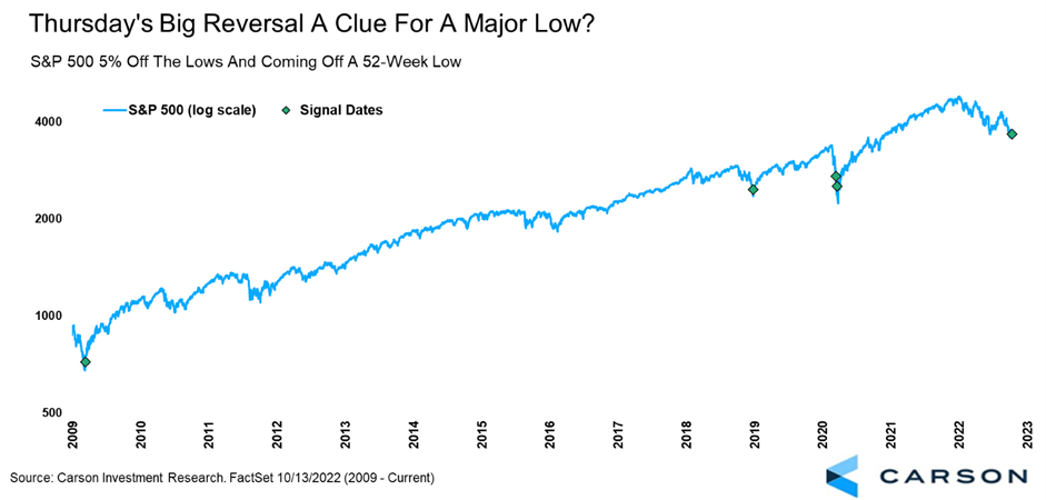 The Consumer Price Index (CPI) came in hotter than expected and stocks sold off very hard, this on the heels of a down market six days in a row. Then, a funny thing happened. The S&P 500 closed more than 5% off the lows, a very rare sign and one that has taken place at major lows in the past. In recent market history, the S&P 500 closed more than 5% off the lows, while also coming off a 52-week low, in March 2009, December 2018, and March 2020. With the obvious benefit of hindsight, all those points marked a market bottom and signaled future strength.