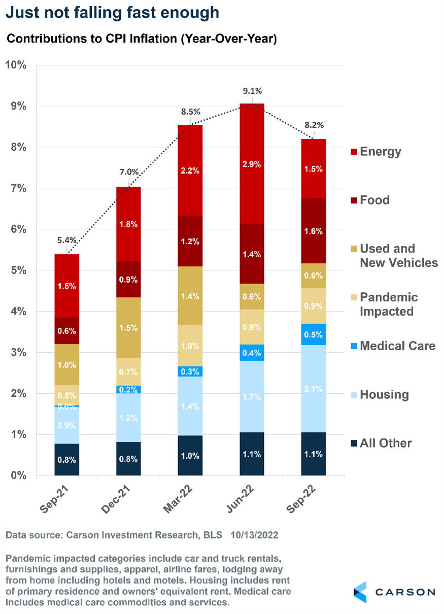 Another inflation report offered more signs that inflation remains stubbornly high. The September Consumer Price Index (CPI) rose 0.4% month-over-month, well above the 0.2% that was expected and above the previous month’s 0.1%. The year-over-year number was 8.2%, down slightly from the previous month’s 8.3%. Meanwhile, core CPI (excluding food and energy) soared a huge 0.6% versus 0.4% expected. The year-over-year increase was 6.7%, up from 6.3% in August.