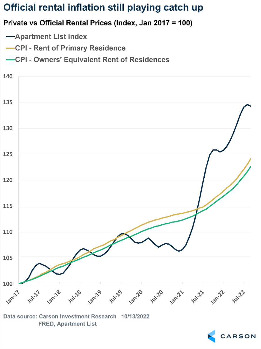 Other positives include data from Zillow, which showed rent prices rose 0.3% in September versus a 1.6% gain in September last year, and a report from Realtor.com, which showed nationwide median rental prices in 50 large metro areas grew at the slowest pace in 16 months in September. Again, this differs from government data.
