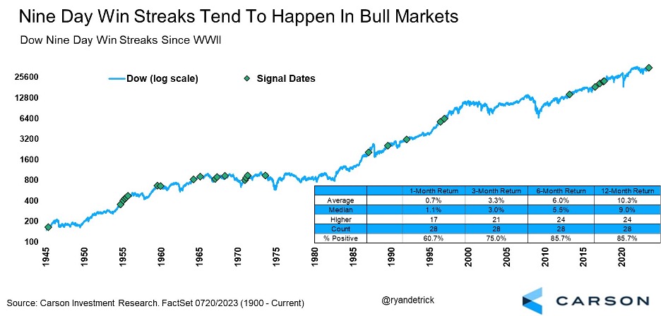 • The Dow is currently on a 10-day winning streak, which is good news for markets.