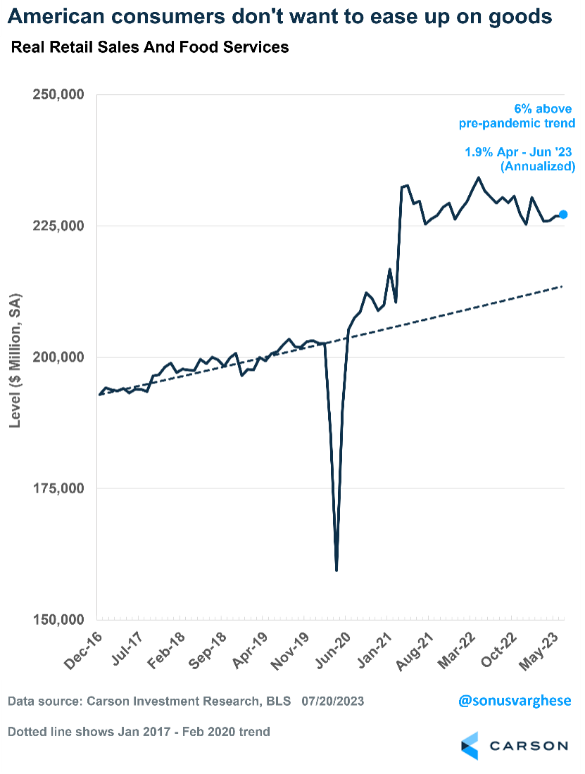 • Even after adjusting for inflation, “real” retail sales rose at a 1.9% annual pace in Q2 and are currently running 6% above the pre-crisis trend!