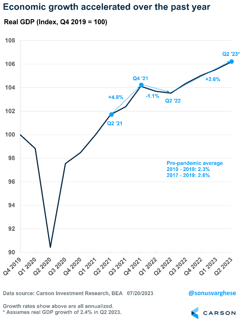 If that is close to actual GDP growth, it would mean the economy grew 2.6% over the past year. That is not only stronger than the average 2.3% pace of growth between 2010 and 2019, but it also matches the pace of growth over the three years prior to the pandemic (2017-2019) when economic growth picked up.