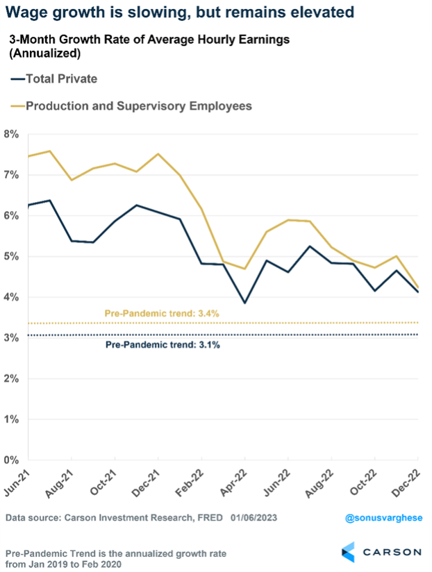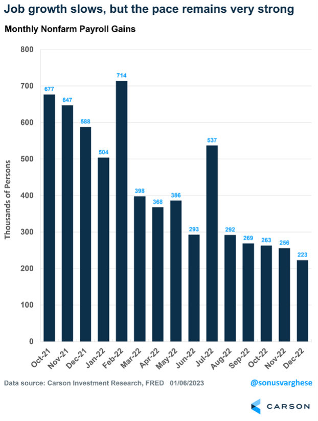 The December payroll report was yet another upside surprise. Monthly payrolls rose by 223,000, above expectations for a 200,000 gain. As Fed Chair Jerome Powell has noted, the economy needs to create about 100,000 jobs a month to keep up with population growth. That’s less than half the current pace.