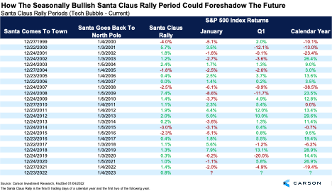These seven days are higher about 80% of the time, and no period is more likely to be positive. At Carson, we take note when the rally does not occur as this typically is a warning sign, such as it was in 2000 and 2008.
