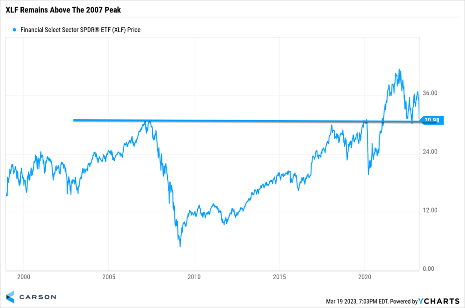 The bottom line is the banking crisis is not over yet, but we don’t think the issues will spread to the entire system. Money is flowing from small banks to large banks, and large banks are in solid financial shape. Lastly, the Financial Select Sector SPDR ETF remains above the 2007 peak. As shown below, this could be one of the most important charts in the world. Should it significantly break the 30 level more trouble could be coming. As of now, it remains above this critical point.