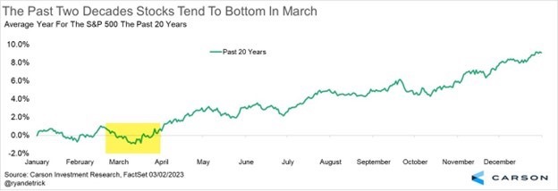 March is well-known for major market lows and volatility. March hit major lows in 2003, 2009, and 2020, amidst negative headlines and sentiment. In fact, over the past 20 years stocks have bottomed in March, as the chart below shows.