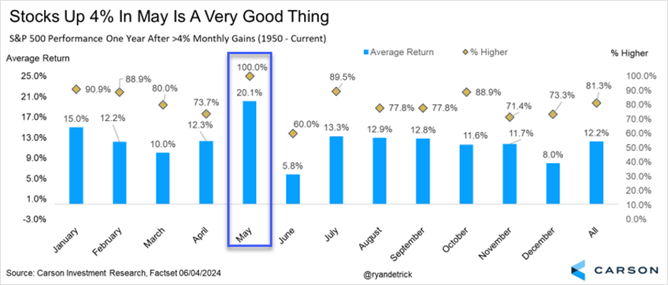 The last bullet point for the bulls is a 4% or greater monthly gain in May suggests continued strength, with the S&P 500 up a year later 81.3% of the time and rising a very solid 12.2% on average. This compares to the average year higher 73.0% of the time and up 9.0%. But it doesn’t end there, as I looked at all 12 months and would you believe that historically the very best returns after a 4% or greater monthly return take place after a big gain in May? A year later stocks have never been lower (10 out of 10 higher) and are up more than 20% on average.