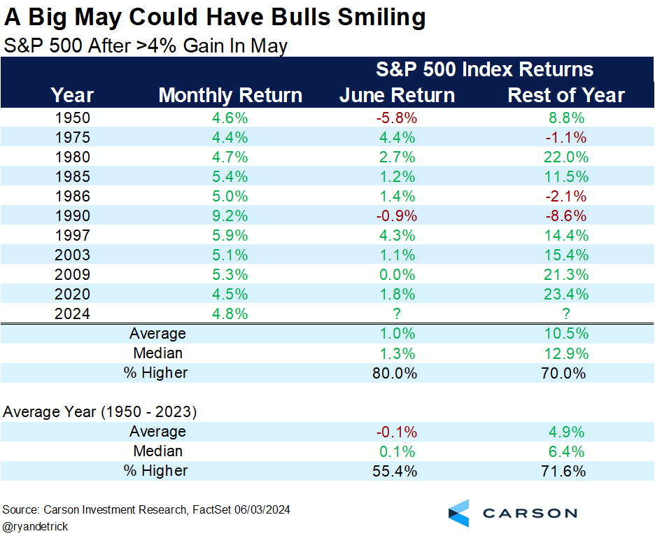 The S&P 500 just missed a 5% gain in May, but 4.8% is pretty darn good, especially considering April lost 4.2%. So what tends to happen after a big May you ask? June, which is historically not a good month, gained eight out of 10 times for a very solid 1.0% average, while the rest of the year was up more than 10% on average, more than double what we typically see over the final seven months of the year. Even more impressive is the past four times this happened (1997, 2003, 2009, and 2020) all saw at least double-digit returns. “MAY”be we have a positive signal from the strong May. Did you see what I did there?