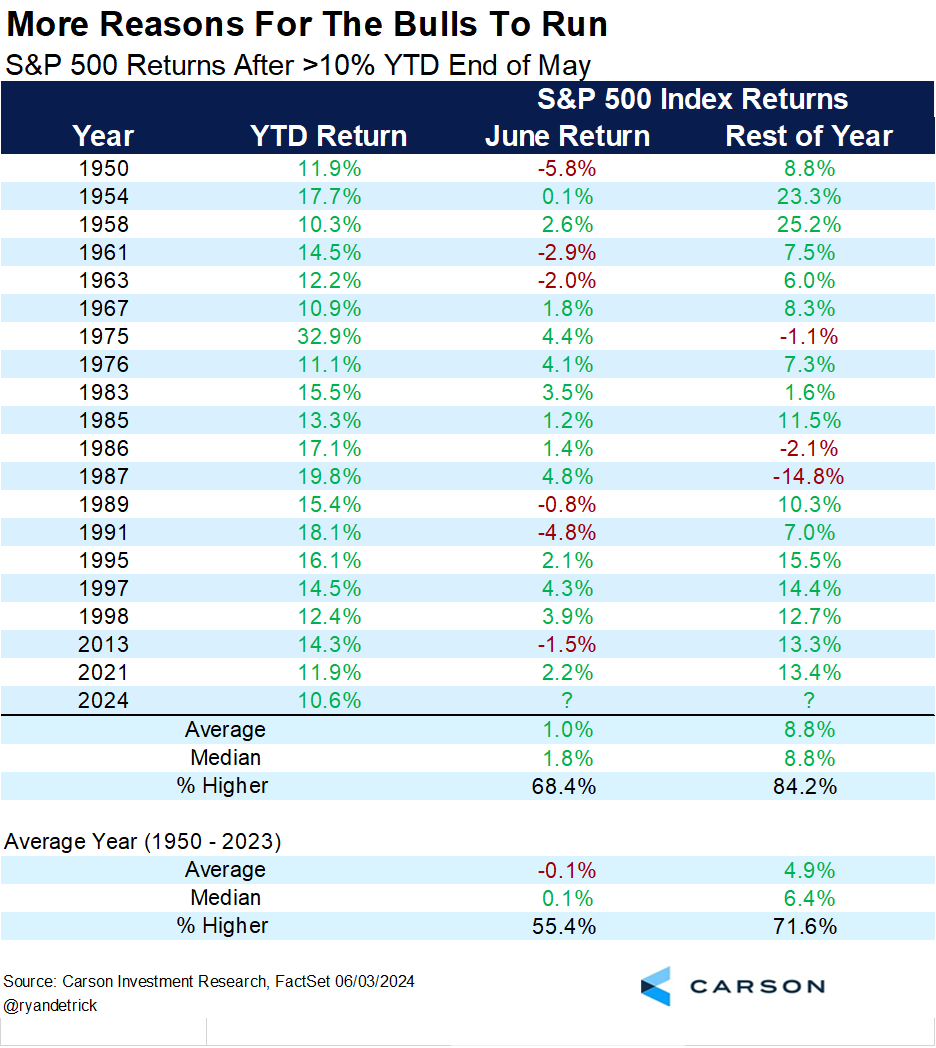 2024 is one of the better starts to a year ever, but you’d never know it if all you looked at were the headlines. All we hear about is how bad things are. How the consumer is tapped out, the economy is headed for a recession, only a few stocks are going up, and so on endlessly. Well, investors should be smiling through all the dour calls and outlooks, as stocks have gained double digits after the first five months this year and the good news is more green could be coming.