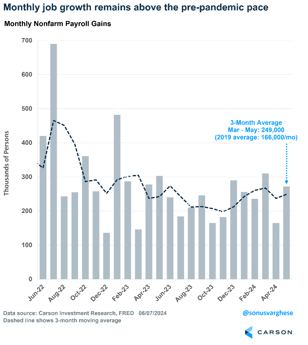 - May job growth surprised to the upside with the economy adding a robust 272,000 jobs.