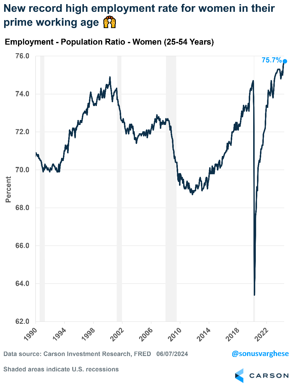 The prime-age employment-population ratio is a steadier measure and it was unchanged at 80.8% in May. That’s only slightly below the high from last summer, and above anything we saw between 2001 and 2019 (when it peaked at 80.4%). In fact, the prime-age employment-population ratio for women hit a record high of 75.5% in April, and it rose to a new record of 75.7% in May. This by itself should tell you the labor market is strong, with more people participating in it.