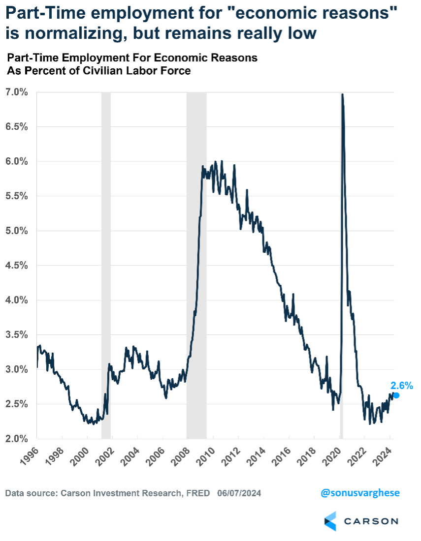 One narrative we’ve seen is that these numbers are good for a bad reason — more people are working part time. But we need to separate the reasons for why people are working part time. Some people may be working part time because they (or their partners) are earning enough, and so they can scale back. What would be worrisome is if more people started working part time because they couldn’t find full-time work. The Bureau of Labor Statistics (BLS) actually measures this, via a metric called “part-time employment for economic reasons.” As a percent of the labor force, this measure is now at 2.6% — matching its level in February 2020 and a tick below the 2019 average of 2.7%. It’s increased over the past year, but that’s likely just the normalization of a labor market that is no longer red hot. As you can see in the chart below, it remains at historically low levels.