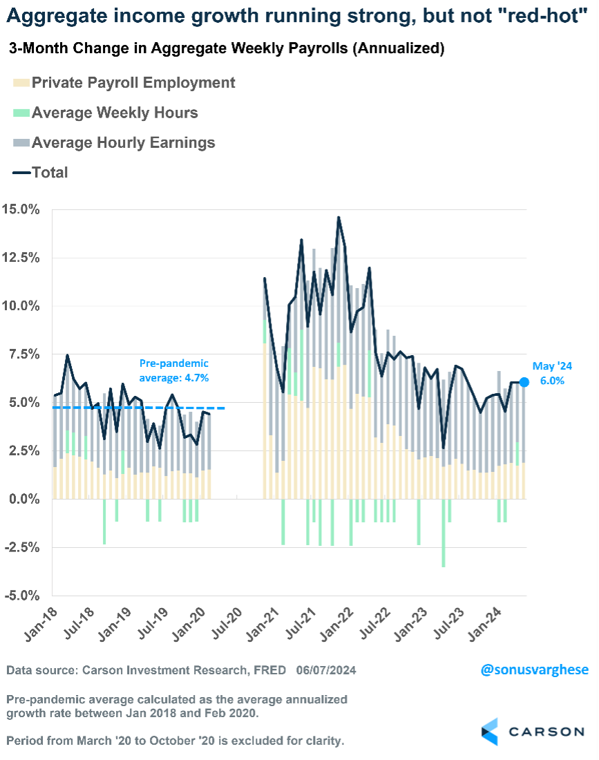 The big picture is that the consumer isn’t really weakening. That also means the economy isn’t weakening, since consumption makes up close to 70% of the economy. While strong job and aggregate wage growth may mean it will take longer for Fed rate cuts to materialize (perhaps only in September now), it also means profit growth remains strong, and that’s ultimately good for the stock market.