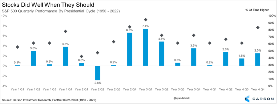 - Carson’s team provides its top charts that tell the story of 2023, including the four-year presidential cycle, high-tech manufacturing, bond yields, equity style performance, and a certain chipmaker that received a lot of attention.