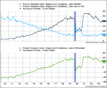 The labor market continues to run strong. The data has shown the labor market has been strong for a long time, with the unemployment rate below 4% throughout last year. But perhaps more importantly for consumer confidence, the perception of the labor market has improved. From The Conference Board’s consumer survey in December, the percentage of respondents saying “jobs are plentiful” rose 2.1 points to 40.7%, while the percentage of respondents saying “jobs are hard to get” fell by 2.4 points to 13.2%. The “labor differential,” which is the difference between the two, edged up 4.5 points to 27.5, which is close to pre-pandemic levels and means that Americans are feeling good about the labor market.