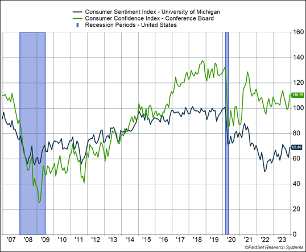 It’s been a puzzle as to why Americans seem to have been in a funk despite strong economic growth, low unemployment, rising incomes (even after adjusting for inflation), and even strong consumption trends. In other words, Americans have been out and about spending, on the back of strong incomes, but confidence has been plunging. In fact, the University of Michigan consumer confidence index has hit levels below those seen in 2020 amid the pandemic, and even levels recorded during the global financial crisis. The Conference Board’s measure has not been as bad, but even that index has recorded numbers below pre-pandemic levels.