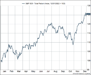 To me, the narrative of 2023 is captured by a chart showing the performance of NVIDIA, the maker of high-end computer chips that have become the bedrock of artificial intelligence (AI). Emerging from the depths of the 2022 bear market, the introduction of ChatGPT illuminated the potential of AI for the layman, igniting a remarkable surge in related tech stocks. Despite higher interest rates, mega-cap technology companies roared higher. As we approach 2024, the AI theme appears enduring. But investors are now recognizing its broader implications as this transformative technology permeates businesses of all shapes and sizes, not just mega-cap tech.