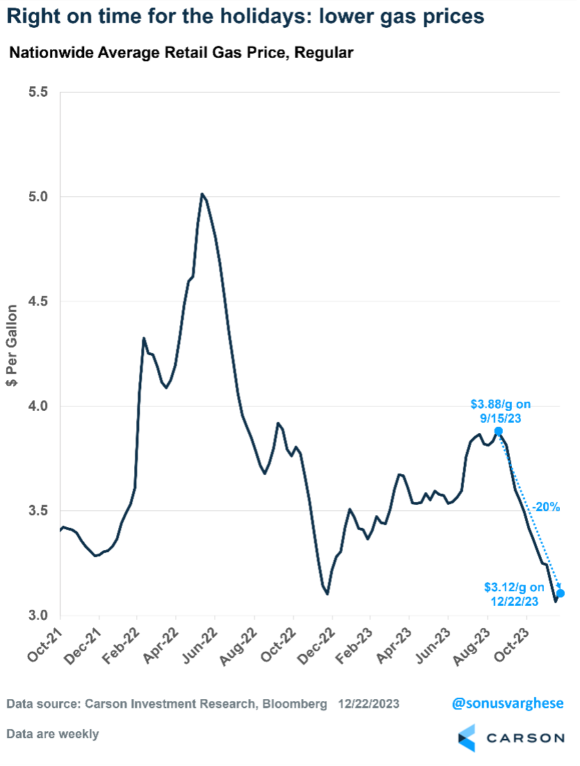 Two, gas prices have fallen 20% since mid-September. Nationwide, average gas prices have fallen from $3.88/gallon in mid-September to $3.12/gallon. That’s as good a way to usher in the New Year as any. Gas prices are perhaps the most salient part of inflation, and lower prices give households the perception that inflation is easing, never mind what official data suggests.