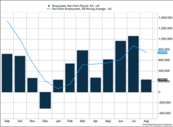 Weak job creation in the service sector contributed to the sluggish report. The service sector only created 203,000 jobs, lagging each of the previous two months by more than 500,000 jobs. Restaurant hiring dropped sharply as the leisure and hospitality industry reported flat employment. Between April and July, leisure and hospitality accounted for 61% of the gains in private payrolls.