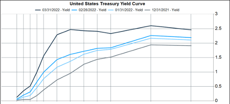 The expectation for a faster increase in rates has pushed short- and intermediate-term rates higher, creating an inverted yield curve. What has been interesting is long-term rates aren’t moving higher as quickly as short-term rates. This interest rate trend reflects an expectation the Fed will raise rates quickly and perhaps too far and then reverse that decision as inflation fades and the economy doesn’t grow fast enough to match the supply of labor joining the workforce.
