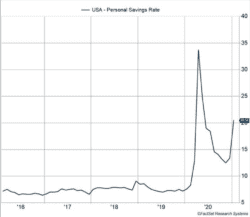 The impact of government stimulus checks continues to permeate economic data. Personal income rose 10% in January, and disposable income rose 11.4%. Where did the money go? It primarily bought goods or was saved. Goods spending rose 5.8% in January, and the personal savings rate jumped to 20.5% from 13.4% the previous month (Figure 1). Limits on activity continue to pressure services spending, which rose only 0.7%.