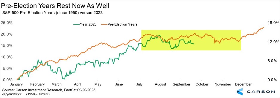 The September swoon continued last week, as stocks sold off hard after the Fed’s decision to leave interest rates unchanged. This type of seasonal weakness shouldn’t be a surprise. We’ve been discussing the potential for August and September volatility for a while now. It’s important to remember the S&P 500 had its best start after seven months to any year since 1997, so some type of weakness in the troublesome months of August and September is normal. Pre-election years tend to be very strong for stocks the first half of the year; then they chop around in the fall months before a furious late-year rally to new highs. This year has checked the first two steps off the list, and we still expect new highs before it ends.