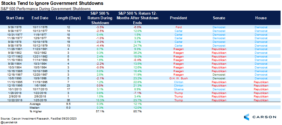 - A government shutdown looms, yet history suggests this is a non-event for investors.