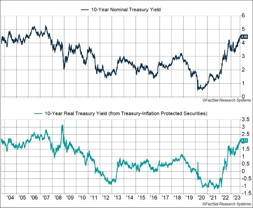This is different from what investors expect. Market expectations for the implied policy rate in 2027 has increased from 3% to almost 4% over the last four months. This has resulted in a significant increase in long-term Treasury yields. Ten-year nominal yields are close to 4.50%, which is the highest they’ve been since 2007. Even yields on 10-year Treasury Inflation-Protected Securities, i.e., real yields, have hit 2%.