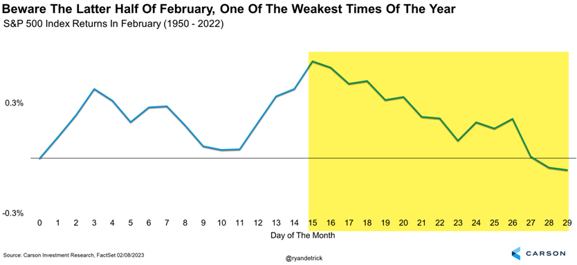 Last week, we noted the potential was high for a well-deserved break for stocks after a red-hot start to the year. That seasonal weakness may have begun. The S&P 500 is typically down in February, which joins September as the only other month to average in the red. But as we shared last week (and will share again as we think it is important), trouble usually brews in the later part of the month. In other words, don’t be overly worried should stocks see red in the coming weeks.