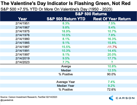 - Robust starts to the year as of Valentine’s Day tend to resolve higher for the bulls.