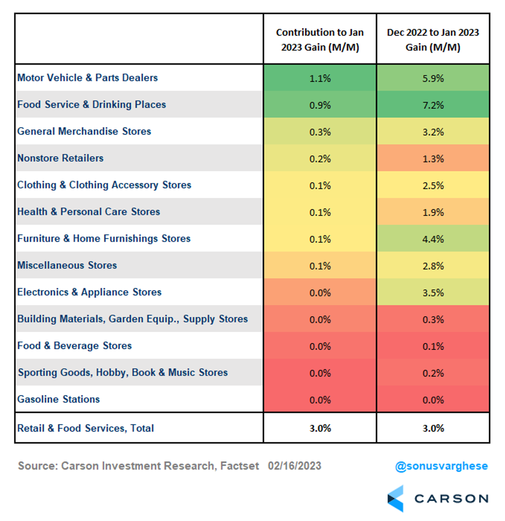 Retail sales and food services surged 3% in January, making a mockery of expectations for a 1.7% gain. That was the largest monthly increase since March 2021, which came on the back of stimulus checks. So, excluding the 2020-2021 recovery period, which saw large drops and gains, October 2001 was the last month to post larger gains. And even that was a rebound after a depressed September.