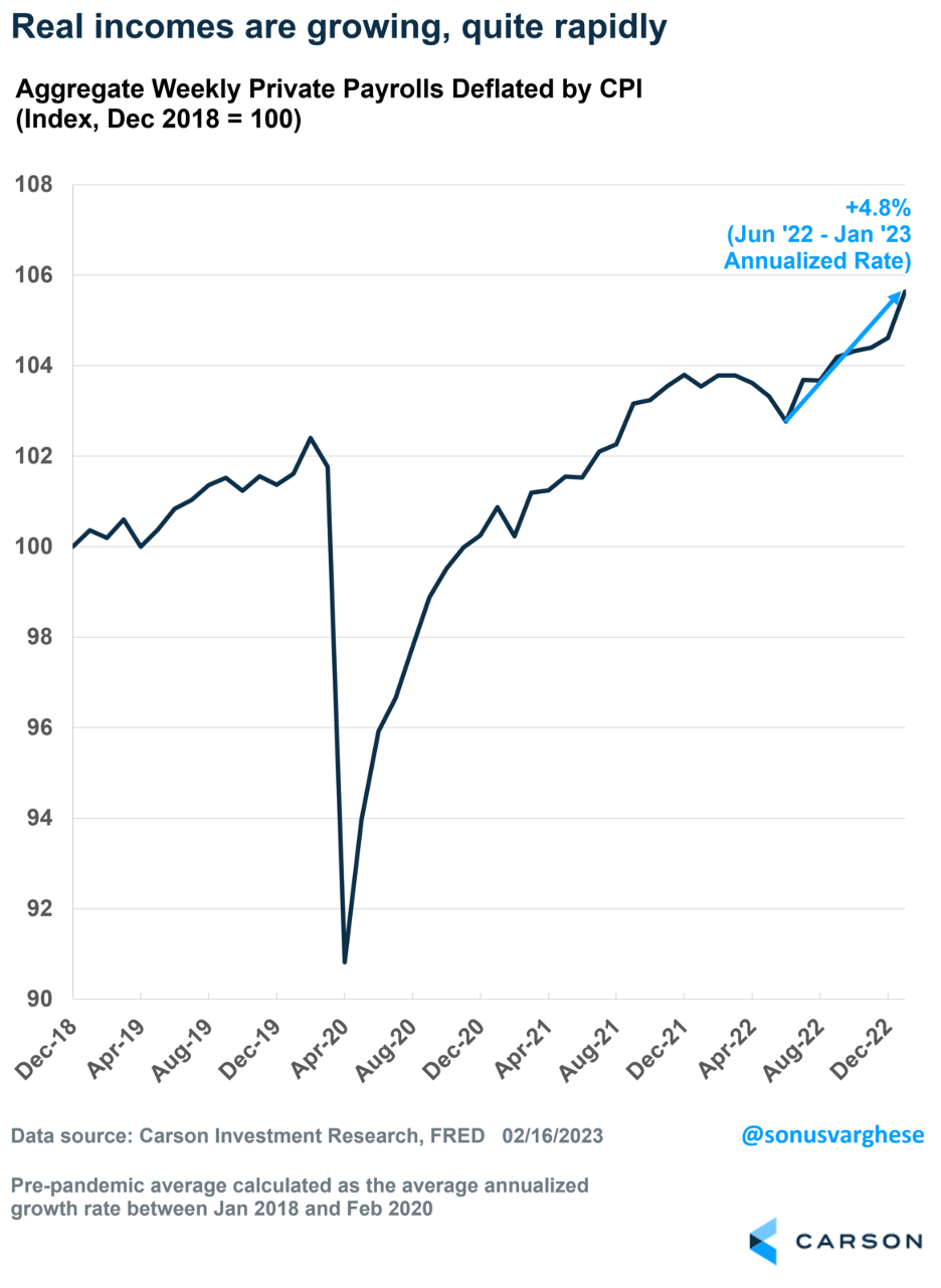 Let’s make this clear. It is nearly impossible to have a recession when consumers are spending like this, as the consumer makes up close to 70% of the economy. Yes, housing is in a recession and manufacturing likely is as well, so by no means are conditions perfect. Some analysts call this a rolling recession, with parts of the economy in a recession and others not. We can’t totally disagree, as those who work in mortgages refinances had a historically bad year. But those who work in other industries, such as restaurants, had an excellent year. We’ve been saying for months that with a consumer this strong, our base case is no recession in 2023. We continue to believe that.