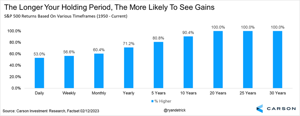 Jack Bogle, founder of Vanguard, once said, “The stock market is a giant distraction to the business of investing.” We agree. The daily news and worries are real and likely will impact how investors view their investments, but taking a long-term view is extremely important. Sometimes we are our own worst enemies when it comes to investment decisions. The desire to sell at the worst possible time has influenced investors throughout history. This is why working with your Carson Advisor is so very important to reaching your long-term goals.