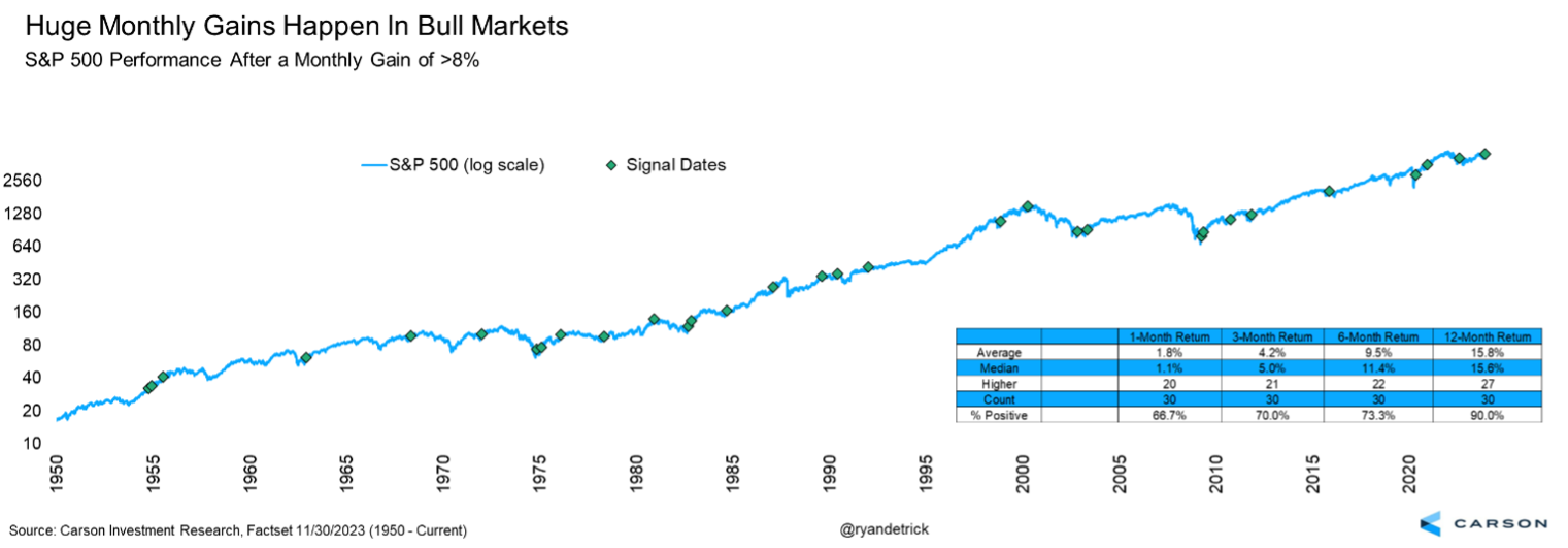 Here’s the good news for investors. Huge monthly gains tend to happen near the beginning of bullish trends. In fact, after a monthly gain of at least 8%, the S&P 500 has been up a year later 90% of the time for an average of 15.8%.