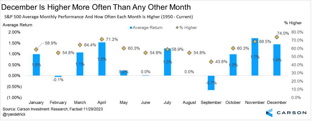 Here’s some more good news. There is no month stronger than December, which has experienced gains 74% of the time and is up a very impressive 1.4% on average.