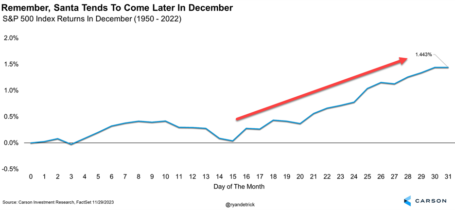 The average return for December jumps to 2.9% in a pre-election year, such as we are in now. And our research shows returns have also tended to be strong when stocks were up more than 10% heading into December, ending the year higher 17 of the last 20 times and 12 of the last 13. In other words, expect markets to chase year-to-date returns this month.