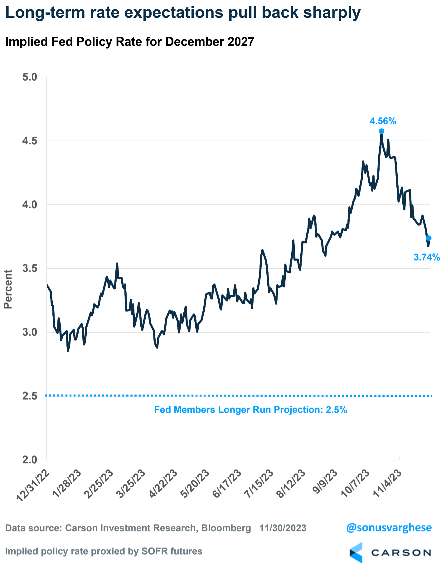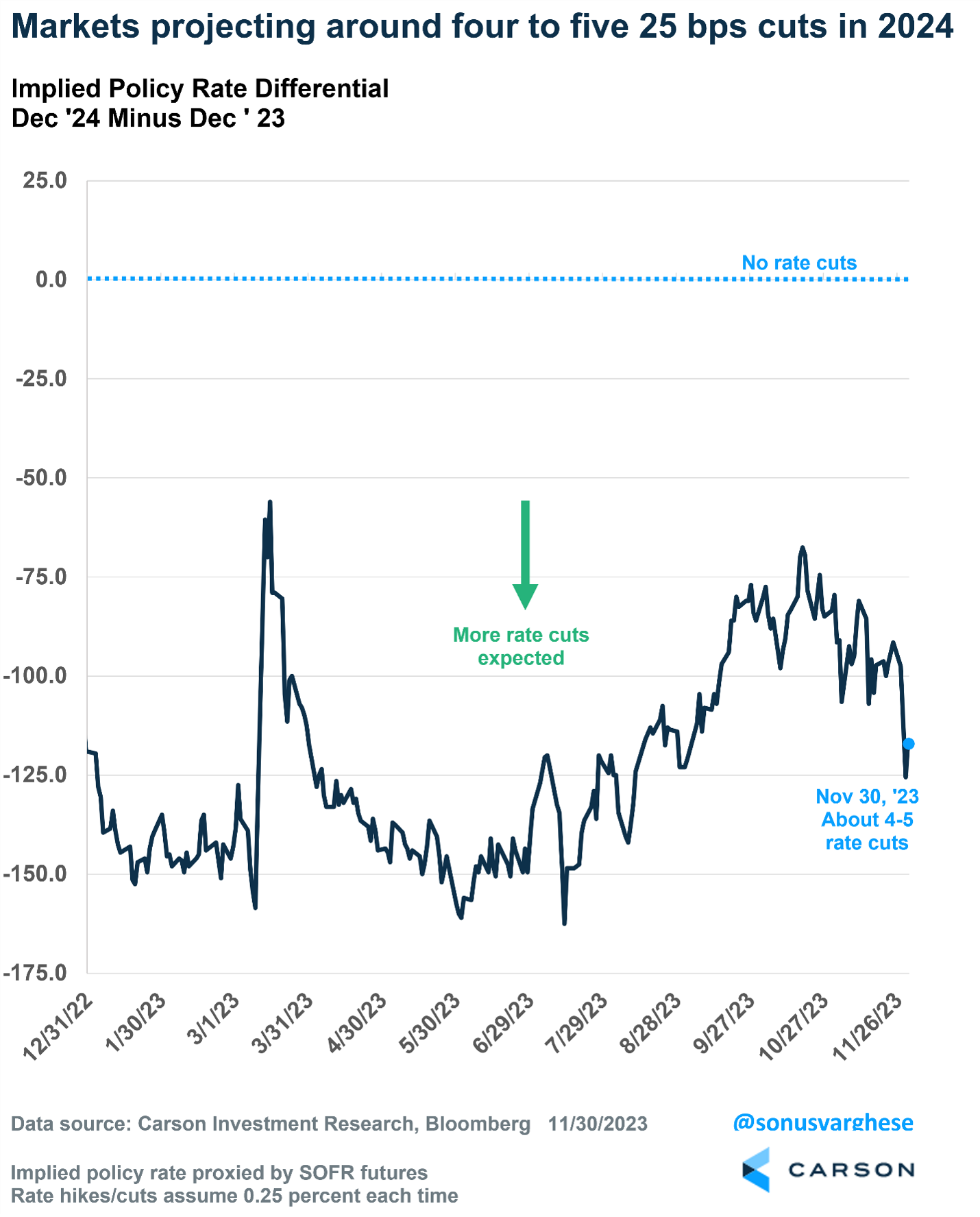 Not only are there no more rate hikes expected, but the groundwork is in place for a pivot to rate cuts in 2024. Investors are currently pricing in close to 50% odds for the first 0.25% rate cut to happen by March and two cuts by June. We’re a tad skeptical that the Fed will cut as early as March — Fed members will likely want to see more data before proceeding with the first cut — but one rate cut by June is possible.