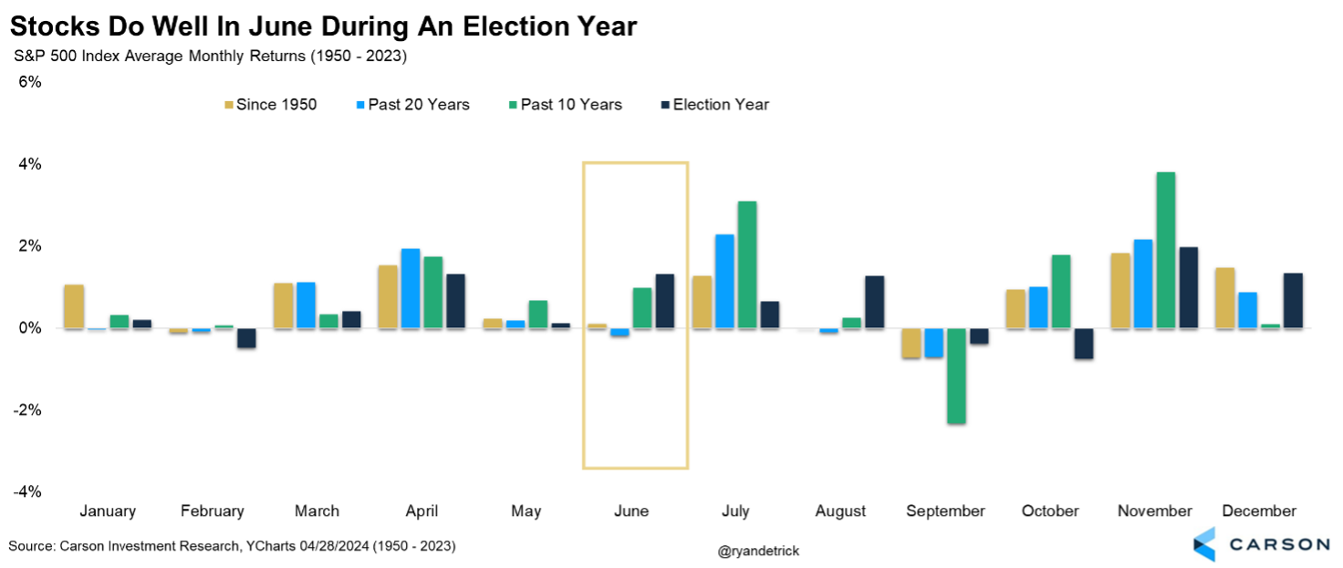 - While June is historically a weak month, it fares much better in election years and a strong May suggests strength in June, the rest of the year, and even over the next 12 months.