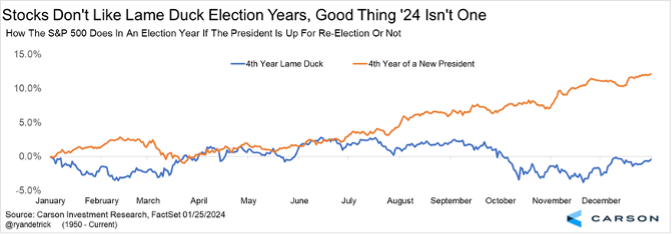 Here’s a chart we’ve shared many times this year. It shows that when a president is up for re-election, the second half of an election year does quite well, compared with a lame duck president, which typically means rough seas are coming. We will have a lame duck election in 2028, since whether President Biden or former President Trump wins in November, we’ll have a second term president (excluding some unforeseen circumstance, of course). But it’s too soon to think about 2028.