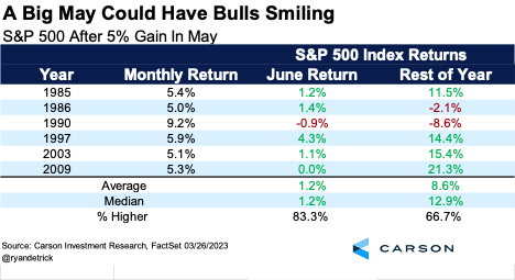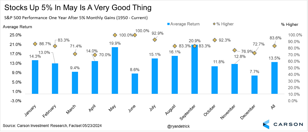 The S&P 500 Index price (that is, excluding dividends) did not reach 5% in May, but including dividends and rounding to one decimal place it did with a 5.0% gain on the nose. While not an official 5% index gain, we think it’s close enough to look at what has happened in the past when there has been a gain of at least 5% in May. We could less poetically look at what happened when there was at least a 4.8% gain, but the numbers will be the same.