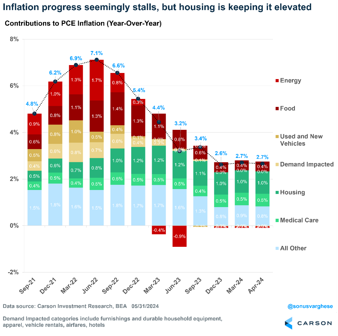 The Fed prefers PCE to CPI because it’s 1) broader, with more categories, 2) dynamic, as underlying category weights can change as consumers shift spending patterns, and 3) can be revised. PCE has been coming in softer than CPI (the so-called “wedge”) – with headline PCE running at 2.7% year over year versus headline CPI at 3.4%. A big reason is that housing (which we have written and talked about, a lot) makes up over a third of CPI versus just 16% of PCE. Still, as you can see below, housing (dark green bar) is a big reason why even PCE remains above the Fed’s 2% target.