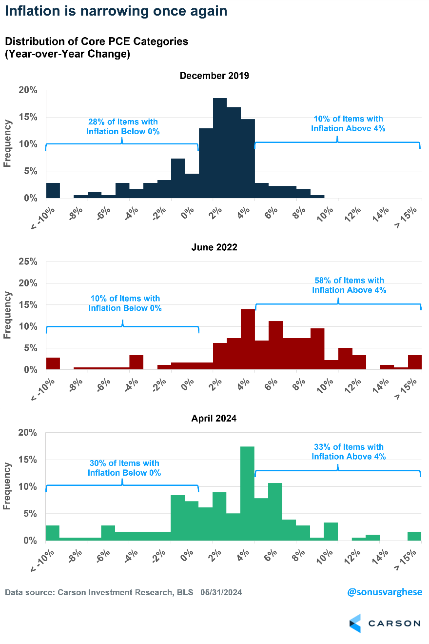 Another way to counter the notion that we haven’t made any progress on inflation since last October is to look under the hood at the distribution of inflation across all categories. I looked at 178 items within core PCE and calculated the distribution of year-over-year inflation at three different times. You can see how inflation really broadened out in June 2022 relative to December 2019 because more categories were experiencing high inflation. The good news is that the distribution is narrowing once again. The picture for April 2024 looks closer to what it looked like in December 2019 than June 2022.