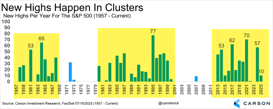 Here’s a nice chart that shows new highs happen in clusters that can last a very long time, and we remain optimistic that many more new highs are still left in this secular bull market.
